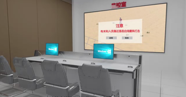 霧陣系統(tǒng)在雷視預(yù)警系統(tǒng)發(fā)現(xiàn)可疑目標(biāo)是就已經(jīng)自動上電準(zhǔn)備,可疑人員繼續(xù)接近隔離網(wǎng)并有破壞行為時,中控室就彈屏請示是否打擊